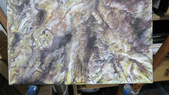 An abstract painting of yellows and oranges, its surface textured like dried clay, evoking the feel of a baked African landscape. Natural disruptions ripple through the ground's surface, while warm shades of purple emerge to give the composition form and shows an animal onlooker's reflection.