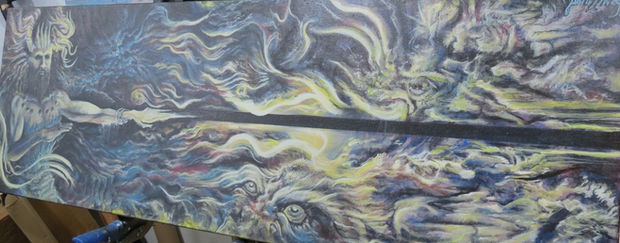 Behind him lies a dark, void like background. Nebulous colours—predominantly blues blended with reds, purples, and bright hints of white and yellow—swirl together. These hues form shapes reminiscent of flowing water and familiar creatures.